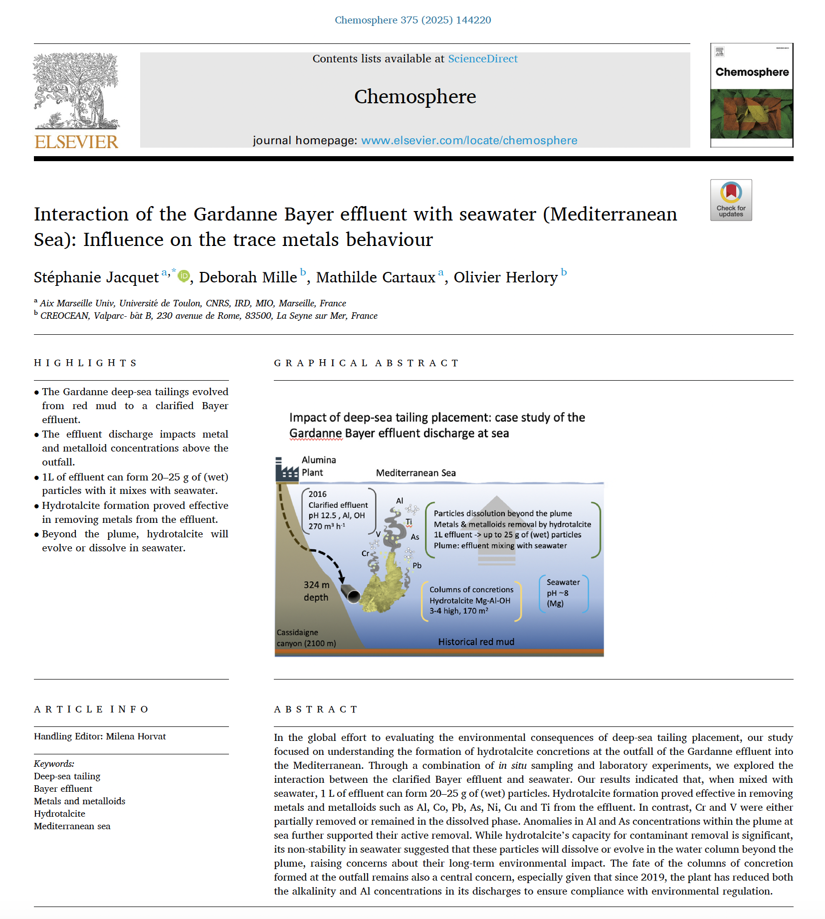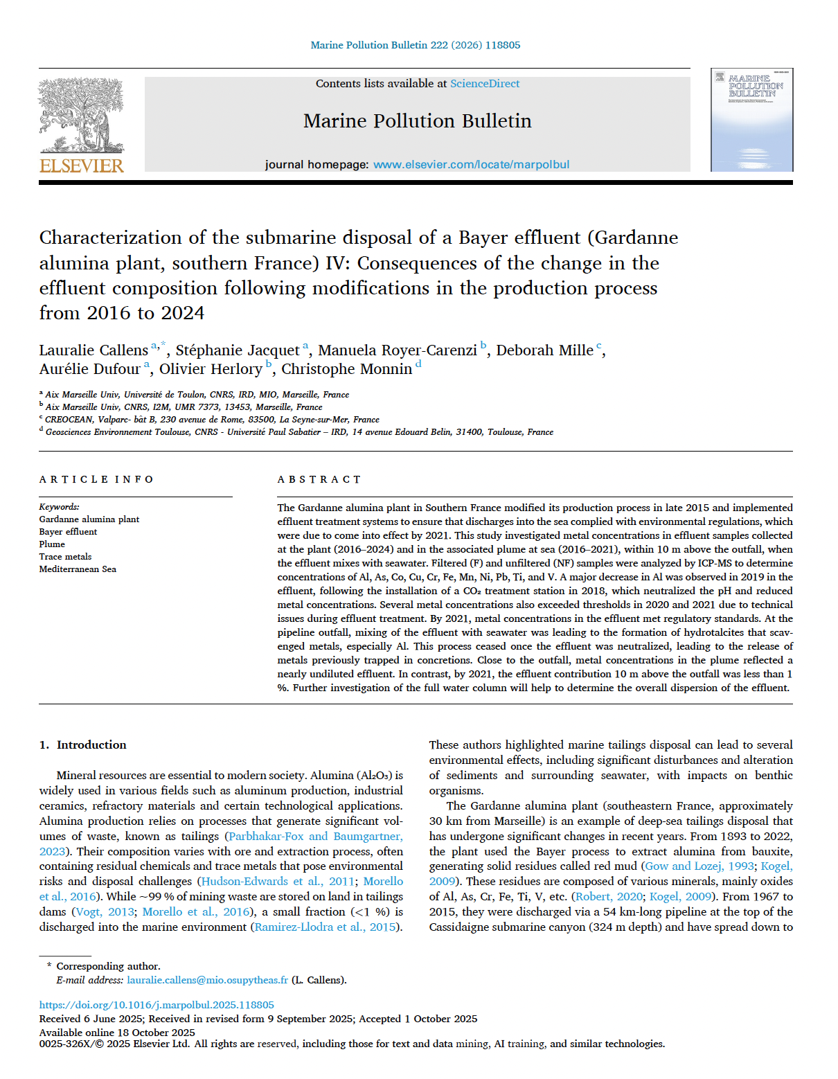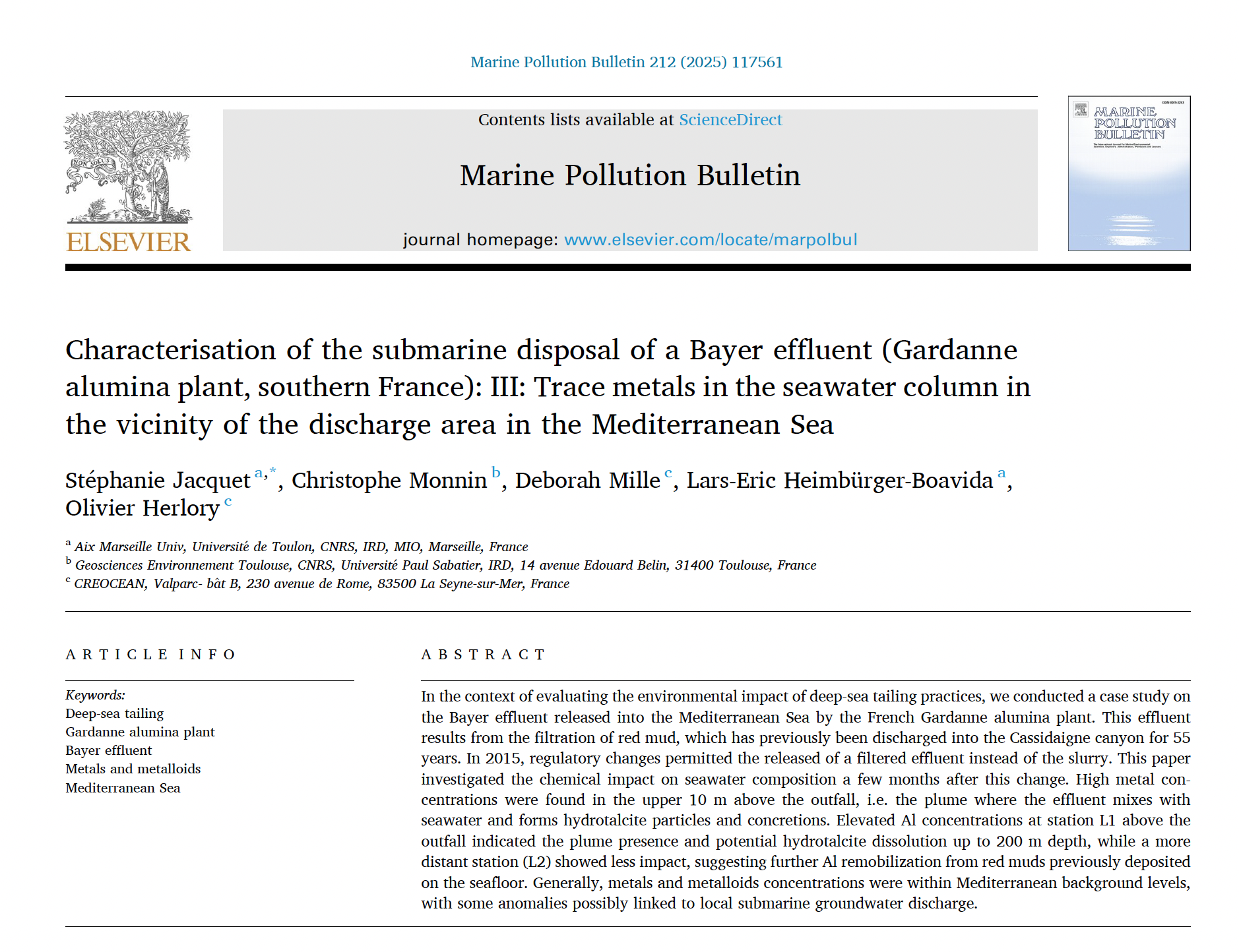 Communication 1: Jacquet S., D. Mille, M. Cartaux, O. Herlory. « Bayer effluent discharge of the Gardanne alumina plant in the Mediterranean Sea: mixing with seawater, particles formation yield and trace metals behaviour”