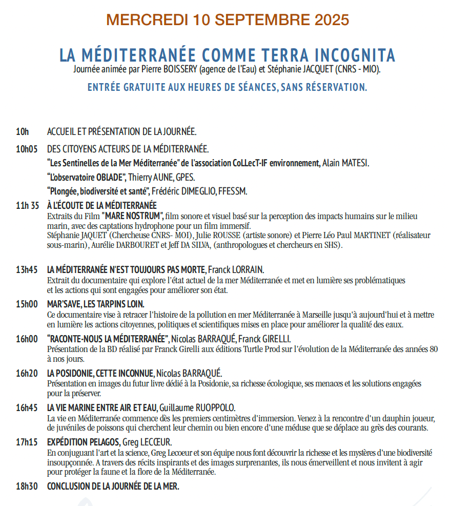 Journée spéciale mer, mercredi 10 septembre: LA MÉDITERRANÉE COMME TERRA INCOGNITA, animée par Pierre BOISSERY (Agence de l’Eau) et Stéphanie JACQUET (CNRS – MIO). C’est un événement grand public, avec de nombreux intervenants issus d’associations, des professionnels et des passionnés de la mer. Les échanges seront très variés, autour des enjeux environnementaux, des initiatives citoyennes locales et des actions concrètes pour la mer.