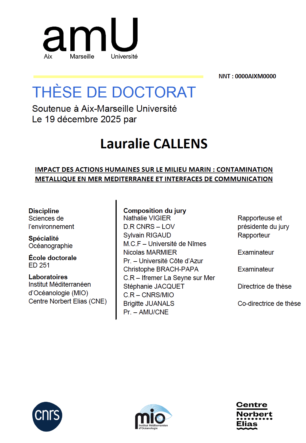 📌 Soutenance de thèse 19/12/2025: Lauralie Callens. « Usine de Gardanne: contaminations métalliques et interfaces de communication » – Thèse MITI CNRS (2022-2025) – Amphithéâtre OCEANOMED, laboratoire MIO, Luminy, Marseille. Direction S. Jacquet (MIO -Océanographie, chimie marine) et B. Juanals (CNE -Sciences de l’information et de la communication).